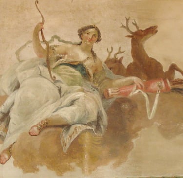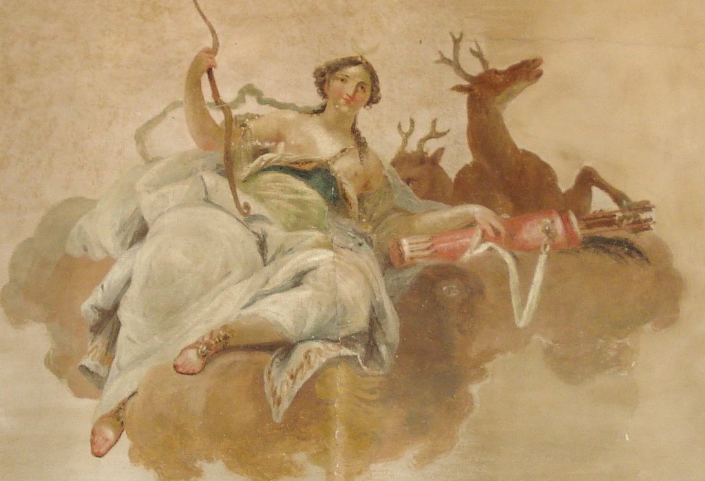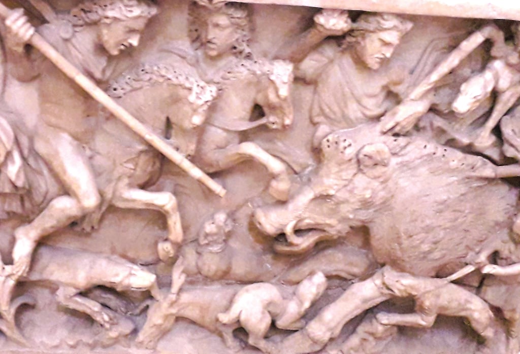 En Etolie, un sanglier extraordinaire ravageait la région de Calydon. Il avait été envoyé par Artémis pour punir Oenée, le roi de Calydon, qui avait oublié de faire une offrande à la déesse. Artémis choisit une bête née d’une truie elle-même terrifiante : rejeton du monstre Echidna et de Typhon, elle terrorisait les habitants de Crommyon près de Corinthe. Ce n’est que la force de Thésée qui en vint à bout lors de son voyage vers Athènes. De ce monstre naît donc un sanglier qu’Artémis utilise pour se venger de l’offense d’Oenée.